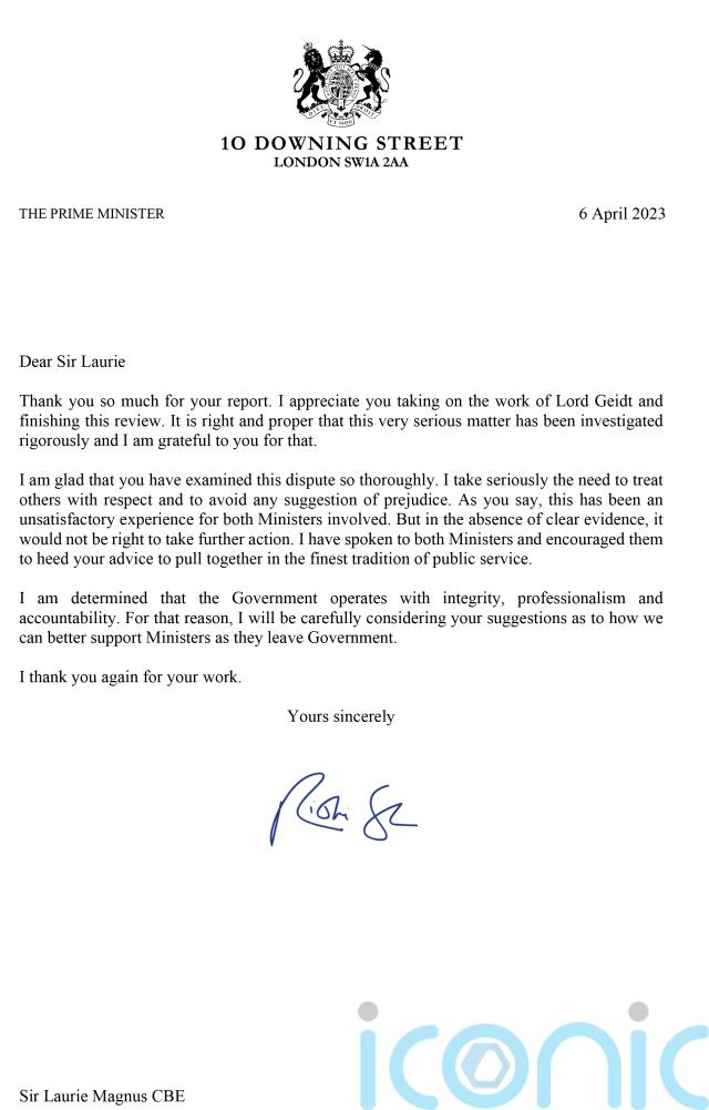 In a letter responding to Sir Laurie’s findings, Mr Sunak said: “I am glad that you have examined this dispute so thoroughly. I take seriously the need to treat others with respect and to avoid any suggestion of prejudice. As you say, this has been an unsatisfactory experience for both ministers involved.