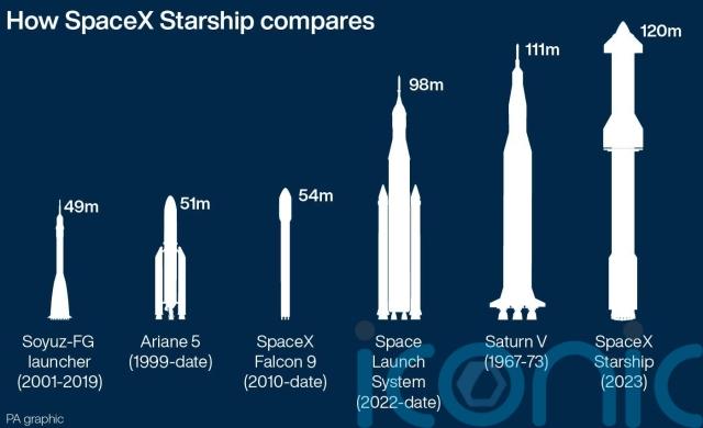 The stainless steel Starship is 120 metres tall, has 33 engines and 16.7 million pounds of thrust.