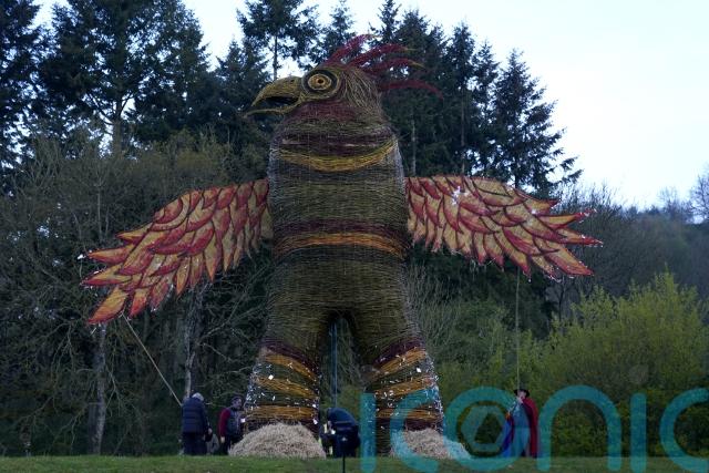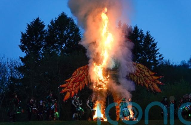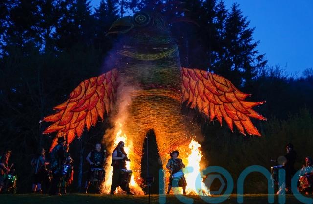 The experimental archaeology site in Waterlooville hosted the burning of a giant winged phoenix “wicker man” at dusk to mark the pagan quarter-day farming celebration of Beltane or Beltain, which has connections to later May Day celebrations.