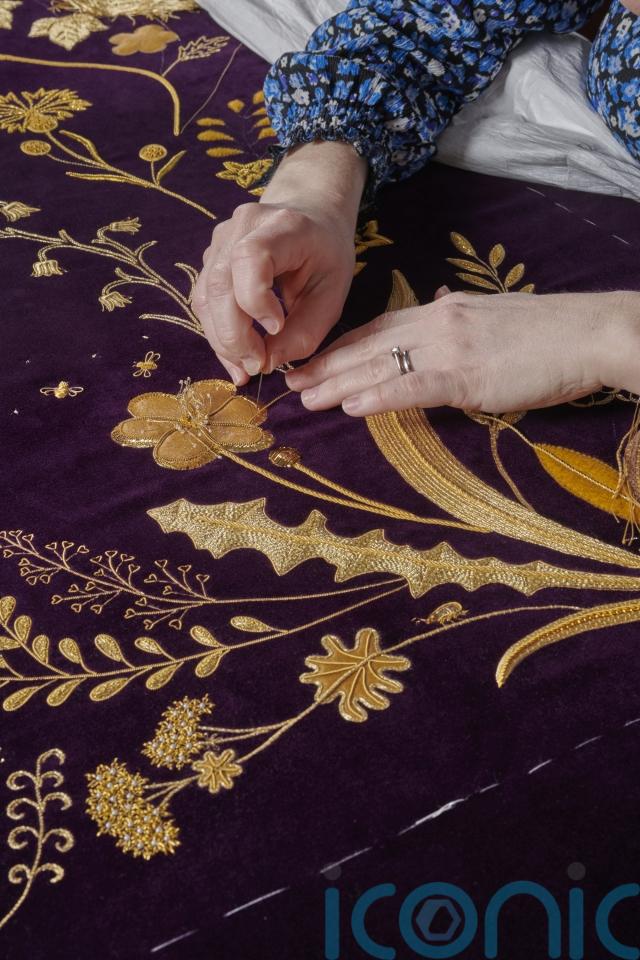 The specially commissioned regal cloak with train is embroidered in goldwork threads, and intricately decorated with bees, a beetle and a host of flowers – drawing on the themes of nature and the environment.
