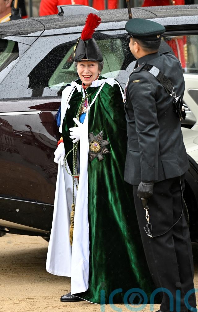 Anne wore her Blues and Royals uniform with the dark green Thistle Mantle, and the Thistle Collar, Garter Sash, Garter Star, Thistle Star, GCVO Star, full sized medals, KCVO Star and Companion of the Order of the Bath neck decoration.