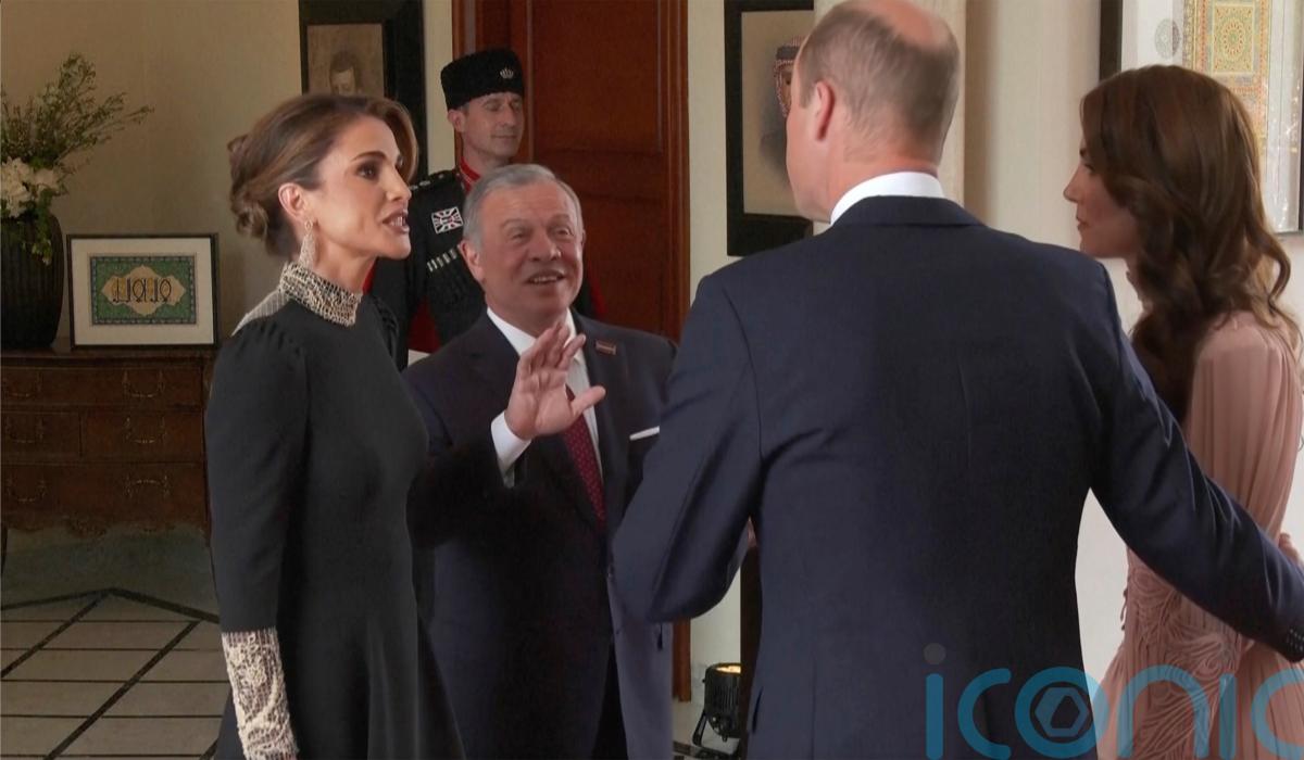Jordan’s ruling monarch and his wife greeted the guests when they arrived and warmly shook hands and kissed the prince and princess, with William nodding his head as a mark of respect when he met the king and Kate curtseying.