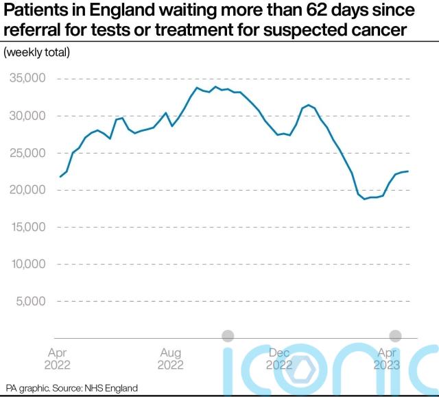 Figures from NHS England show 61.0% of cancer patients who had their first treatment in April after an urgent GP referral had waited less than two months for treatment to start.