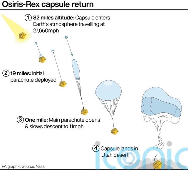 On Sunday September 24, the Osiris-Rex spacecraft will release a capsule carrying the sample when it is 63,000 miles from the Earth’s surface.