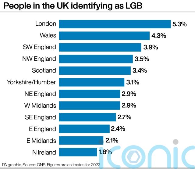 Across the nations and regions of the UK, London has the highest proportion of people aged 16 and over identifying as LGB, at 5.3% or about one in 20.