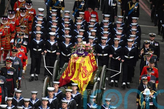 The Queen’s coffin was placed on a 123-year-old gun carriage towed by 98 Royal Navy sailors in a tradition dating back to the funeral of Queen Victoria, with 40 sailors marching behind to act as a brake.