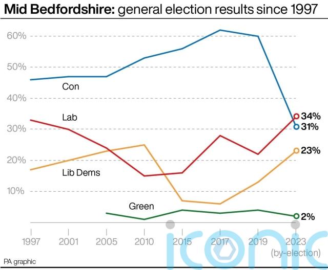 The Conservative share of the vote in Mid Bedfordshire fell from 38% at the 2019 general election to 31%, while Labour jumped from 22% to 34%.