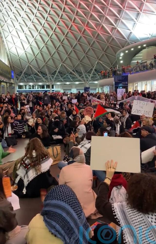In videos, protesters can be seen sitting on the station concourse chanting “ceasefire now”, “free, free Palestine” and “in our thousands, in our millions, we are all Palestinians”.