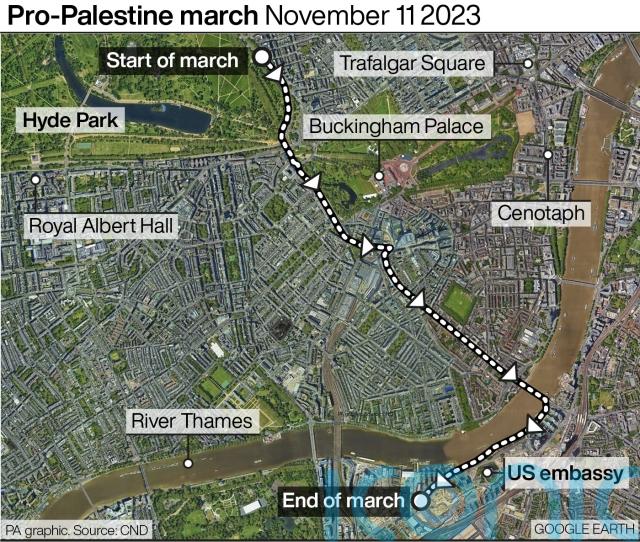 The planned route for the march goes from Hyde Park – about a mile from the war memorial in Whitehall – to the US embassy in Vauxhall, south of the Thames.