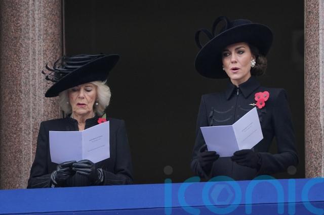 Major Ollie Plunket of The Rifles, equerry to Camilla, laid a wreath on behalf of the Queen, who was watching from a balcony with the Princess of Wales.