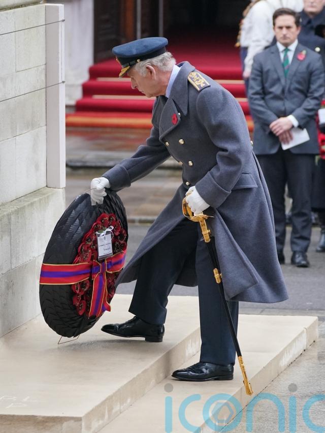 Wearing the uniform of the Marshal of the Royal Air Force with greatcoat, poppy and sword, Charles – who as sovereign is commander-in-chief of the armed forces in the UK and realms – laid a wreath similar to the one produced for King George VI.
