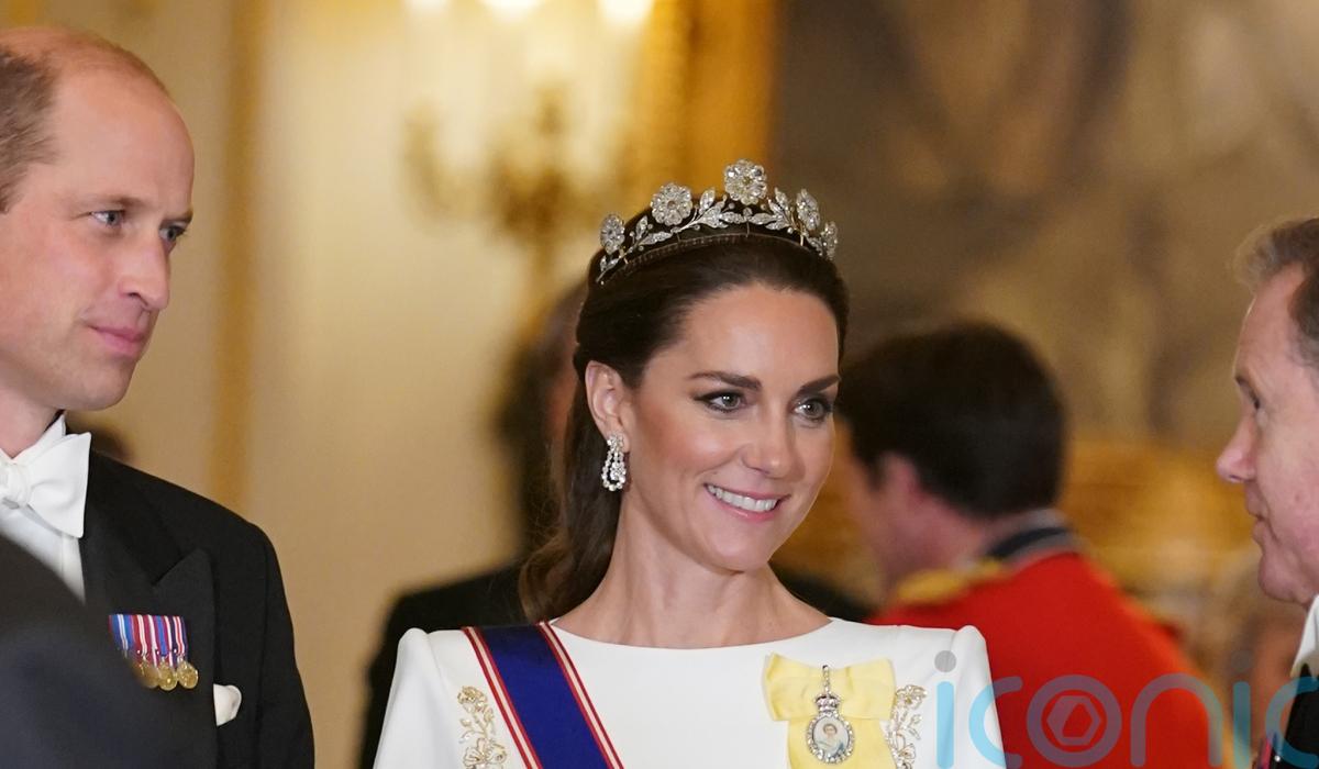 Kate chose the Queen Mother’s delicate Strathmore Rose Tiara for the state banquet in honour of the South Korean president, while Camilla opted for the late Queen Elizabeth II’s impressive ruby and diamond Burmese tiara.
