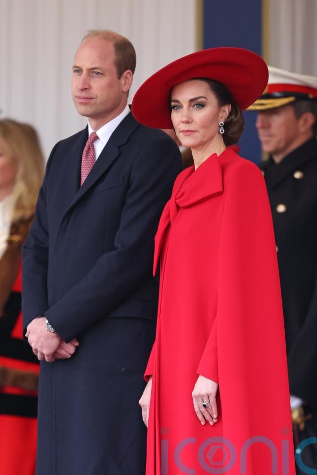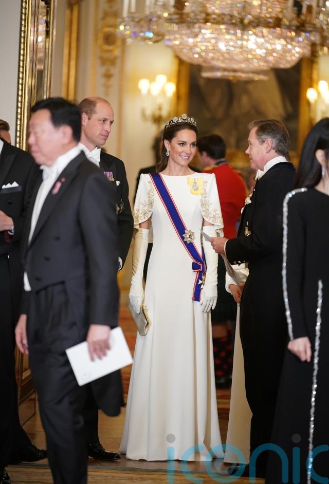 Kate wore a white and gold gown by Jenny Packham and long white gloves, with earrings belonging to the late Queen, as well as the Elizabeth II Royal Family Order and the Grand Cross Victorian Order sash and star.