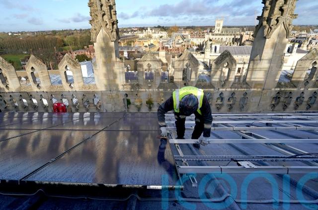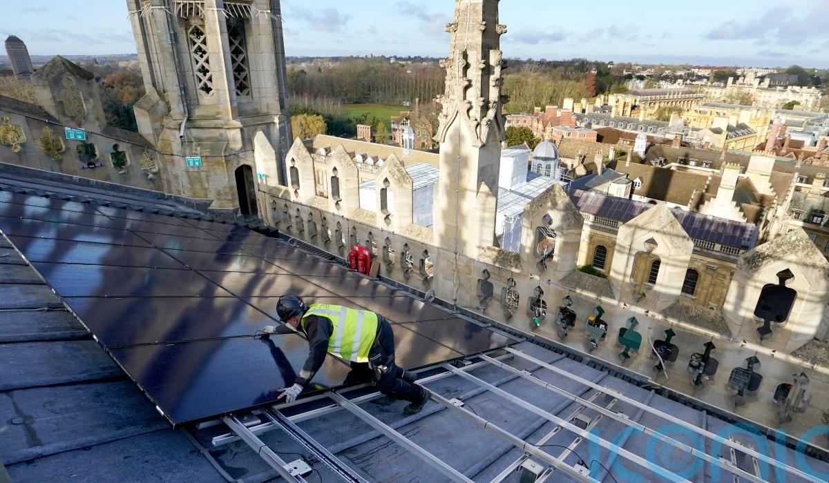 Work to install 438 solar panels on the roof of Cambridge’s King’s College Chapel is under way in a symbol of “commitment to being good stewards of our environment”.