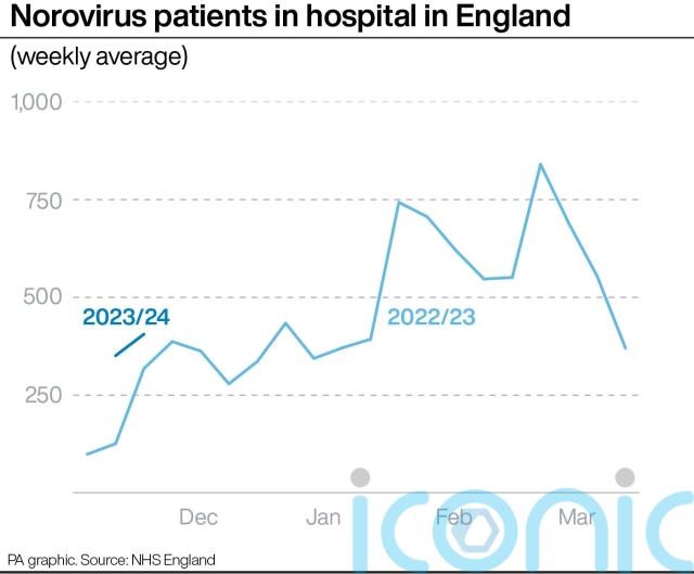 An average of 406 adult hospital beds were filled last week by patients with diarrhoea and vomiting or norovirus-like symptoms, according to data from NHS England.