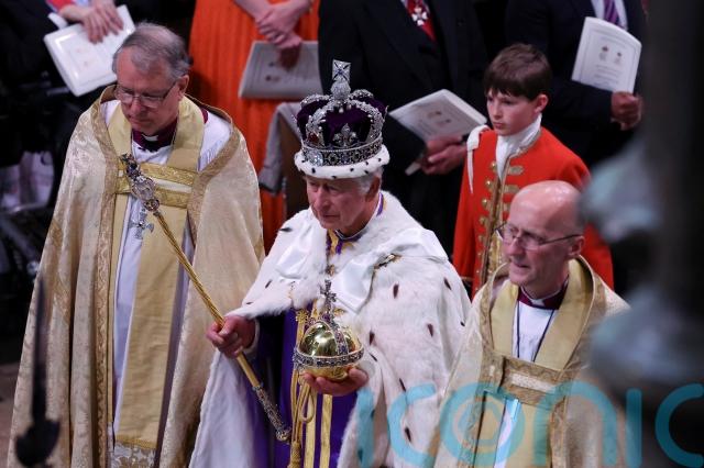 Footage was shown of seated coronation guests, the King processing through the abbey after his crowning, and finally appearing on the palace’s balcony with the Queen as they acknowledged the crowds with a wave.