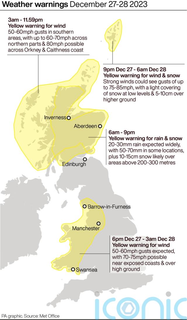 The fastest recorded wind gusts so far are 86mph at Inverbervie on the north-east coast of Scotland, 84mph at Fair Isle and 83mph at Capel Curig, north Wales, the forecaster said.