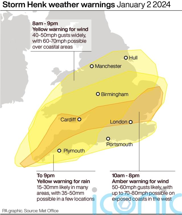 “Storm Henk will initially bring very strong winds to the South West of England and southern Wales, with gusts of up to 80mph possible.