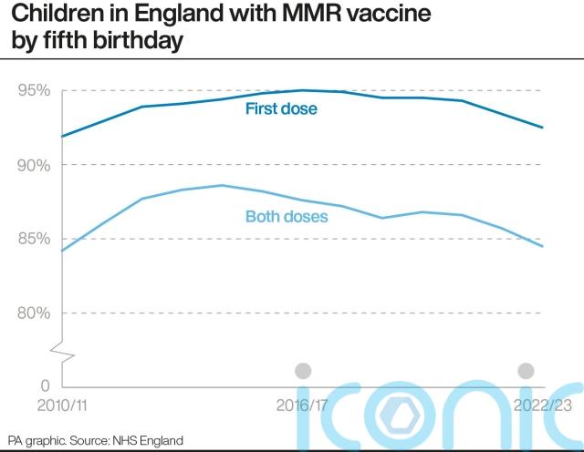 In 2022/23, some 84.5% of youngsters in England had received both doses of the jab by the time they were five years old – the lowest level since 2010/11. Some 92.5% had received one dose.
