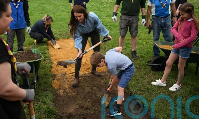 The Prince and Princess of Wales and their children Prince George, Princess Charlotte and Prince Louis lent a hand renovating a Scout hut and its grounds in Slough.