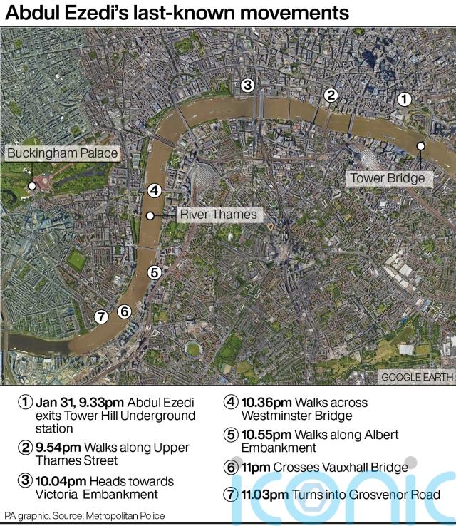 The most recent sighting of Ezedi was at about 9.50pm on Wednesday near Southwark Bridge, although there is no suggestion he jumped into the Thames.