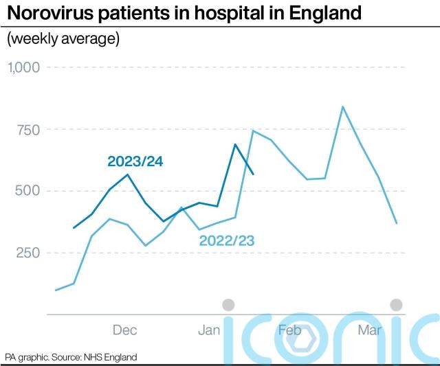 The latest figures for seasonal viruses also indicate that norovirus cases have dropped, with an average of 568 adult hospital beds filled in the week to February 4 by people with diarrhoea and vomiting or norovirus-like symptoms.