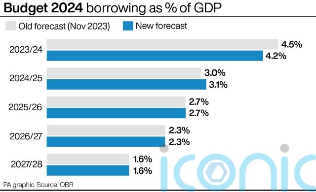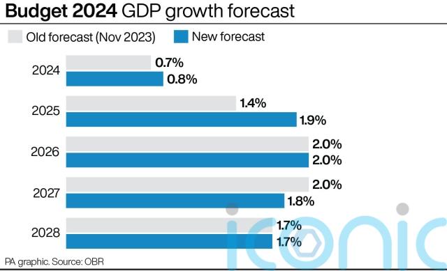 The OBR forecast growth of 0.8% in 2024, up from the 0.7% forecast in November, and 1.9% next year – up from 1.4% on the autumn forecast.
