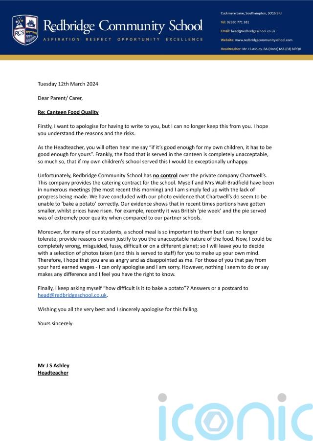 Jason Ashley, head of Redbridge Community School in Southampton, asked: “How difficult is it to bake a potato?” and expressed his anger and disappointment over the standard of the meals in the message to parents and carers.