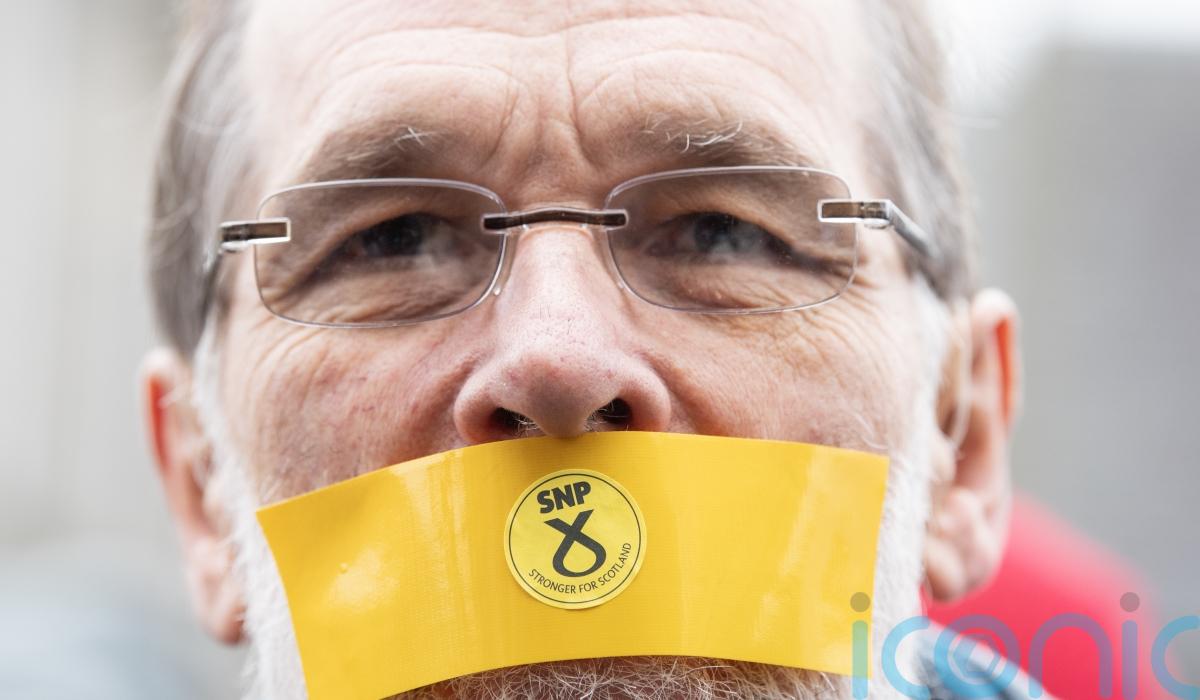 A coffin bearing a sign reading “We hate hate crime laws” was decorated with masks resembling SNP leader Humza Yousaf and co-leader of the Scottish Greens, Patrick Harvie.