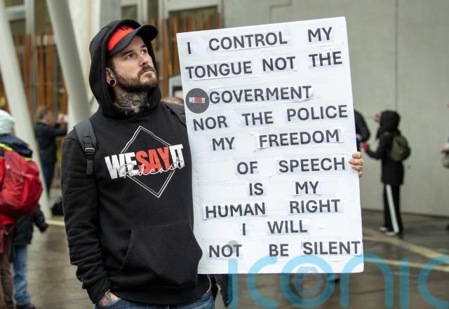The Hate Crime and Public Order (Scotland) Act was described as “totalitarian” and “ammunition for bigots” amid concerns of tit-for-tat reports, with one man taping his mouth closed to show his opposition.