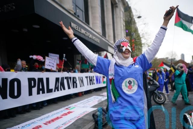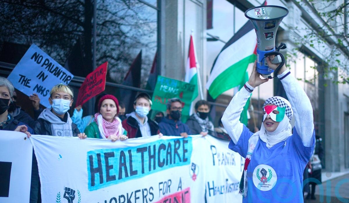 Hundreds of NHS workers protested outside the NHS England HQ in central London on Wednesday morning, holding placards which read “No Palantir in the NHS” and “Palantir aids apartheid”.