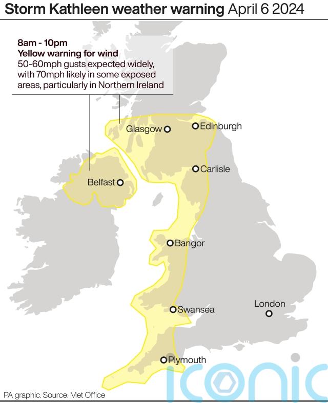 The forecaster issued a yellow weather warning for wind in western areas of the UK, including Northern Ireland, parts of Scotland and Wales, and the north-west and south-west of England from 8am to 10pm on Saturday.