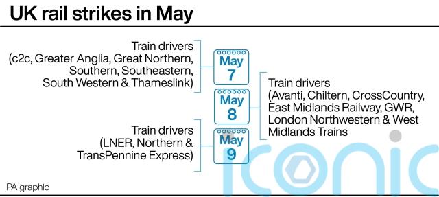 A spokesman for the RDG said: “The rail industry is working hard to keep trains running but it is likely that services on some lines will be affected on the evening before and morning after each strike between May 7 and May 9 because many trains will not be in the right depots to start services the following day.