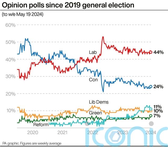 An average of polls for the seven days to May 22 puts Labour on 45%, the Conservatives on 24%, Reform on 11%, the Liberal Democrats on 10% and the Greens on 7%.