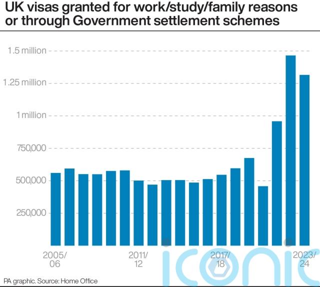 A total of 1.32 million visas were issued in the year to March 2024 to people coming to the UK for work, study or family reasons, or through one of the Government’s settlement schemes, Home Office figures show.