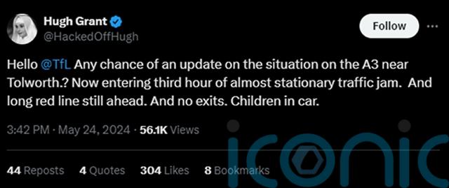Earlier, posting on X, formerly Twitter, as he tried get some clarity on the delay, he asked Transport for London (TfL): “Any chance of an update on the situation on the A3 near Tolworth? Now entering third hour of almost stationary traffic jam. And long red line still ahead. And no exits. Children in car.”