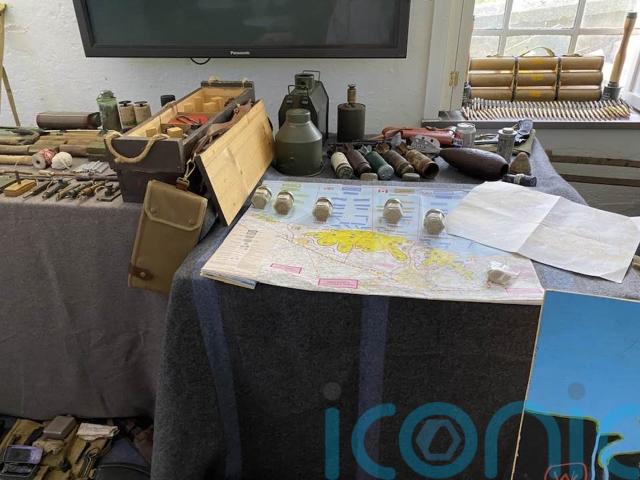 The group displays weapons and explosives, as well as a pot of sand from each of the landing beaches and a lump of concrete from the Merville Gun Battery in Normandy.