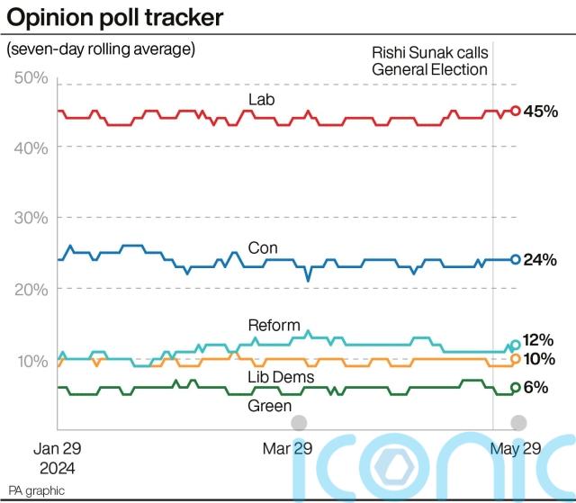 A simple average of all polls that were carried out wholly or partly during the seven days to May 29 puts Labour on 45%, 21 percentage points ahead of the Conservatives on 24%, followed by Reform on 12%, the Lib Dems on 10% and the Greens on 6%.