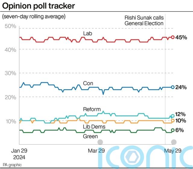 A simple average of all polls carried out wholly or partly during the seven days to May 29 puts Labour on 45%, 21 percentage points ahead of the Conservatives on 24%, followed by Reform on 12%, the Lib Dems on 10% and the Greens on 6%.