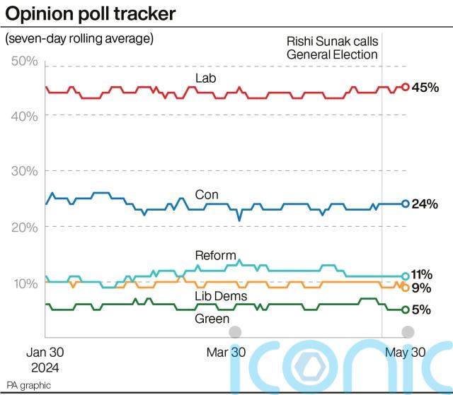 A simple average of all polls that were carried out wholly or partly during the seven days to May 30 puts Labour on 45%, 21 percentage points ahead of the Conservatives on 24%, followed by Reform on 11%, the Lib Dems on 9% and the Greens on 5%.