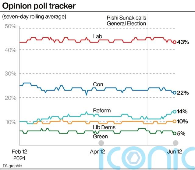 An average of all polls that were carried out wholly or partly during the seven days to June 12 puts Labour on 43%, 21 points ahead of the Conservatives on 22%, followed by Reform on 14%, the Lib Dems on 10% and the Greens on 5%.
