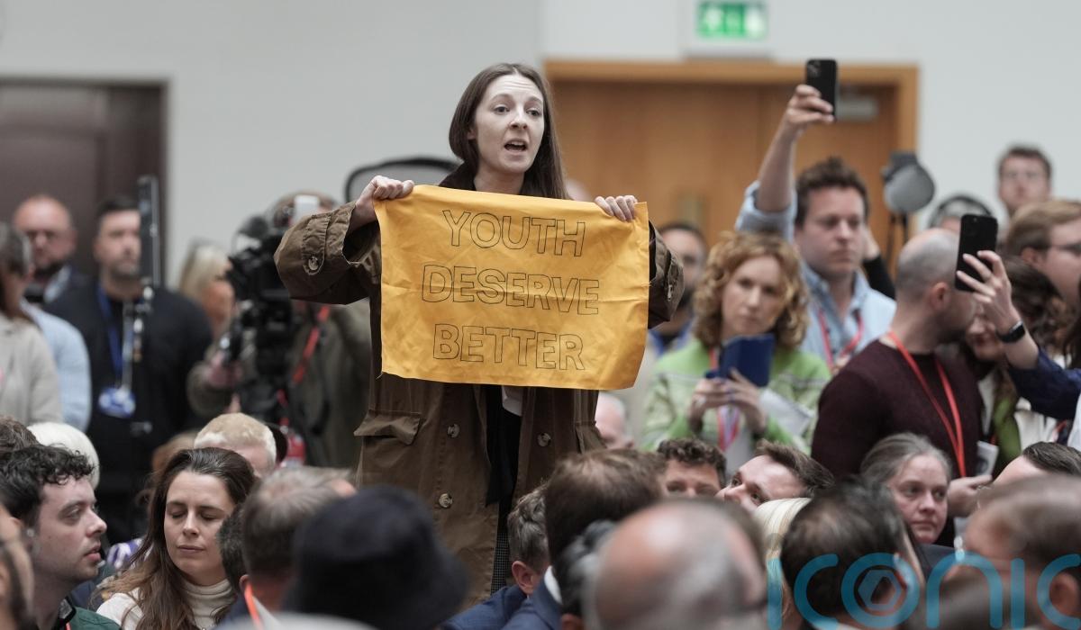 “We gave up on being a party of protest five years ago, we want to be a party in power,” he said to loud applause and cheers from the audience as the demonstrator was bundled out by a security guard.