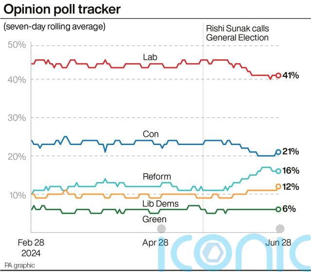 An average of all polls with survey work completed during the seven days to June 28 puts Labour on 41%, 20 points ahead of the Conservatives on 21%, followed by Reform on 16%, the Lib Dems on 12% and the Greens on 6%.