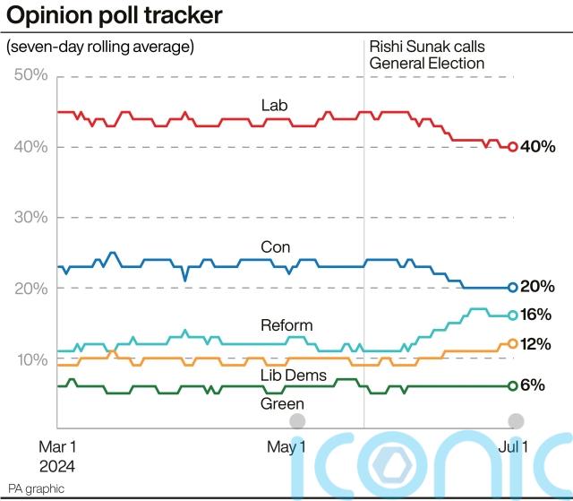 An average of all polls with fieldwork completed during the seven days to July 1 puts Labour on 40%, 20 points ahead of the Conservatives on 20%, followed by Reform on 16%, the Lib Dems on 12% and the Greens on 6%.