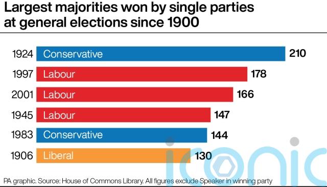 The record for the largest majority won by a single party at a general election since 1900 is 210, set in 1924 by the Conservatives.