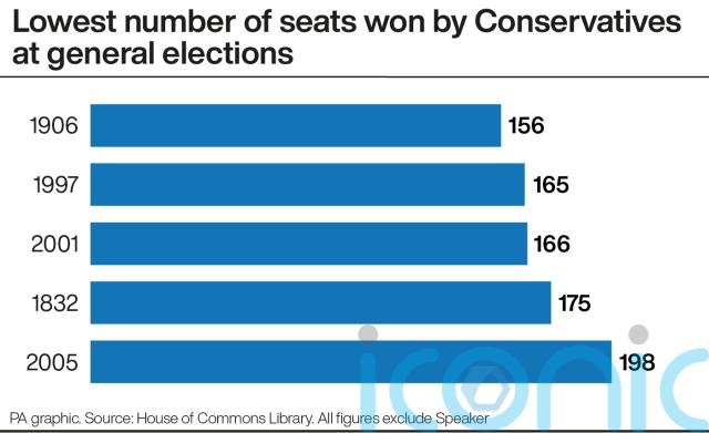 The fewest seats won by the Conservatives at any general election since the party was formally established in the 1830s is 156 in 1906, followed by 165 in 1997.