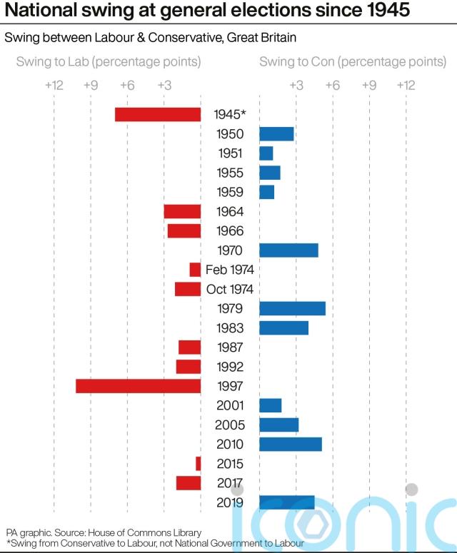 The largest swing from Labour to Conservative since the war was 5.4 percentage points, in 1979.