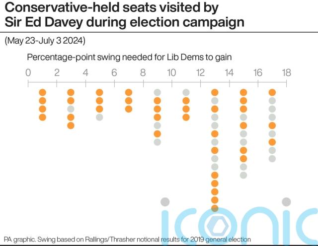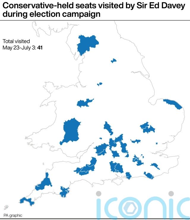 These are the 41 Conservative-held seats Sir Ed Davey visited during the election campaign, together with the notional Tory majority in 2019.