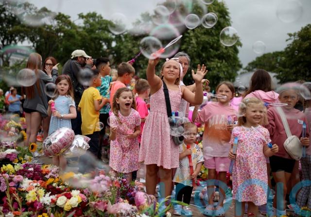 Children blew bubbles and others left flowers and heart-shaped balloons on Monday evening in remembrance of the victims of the stabbing attack at a Taylor Swift-themed holiday club.
