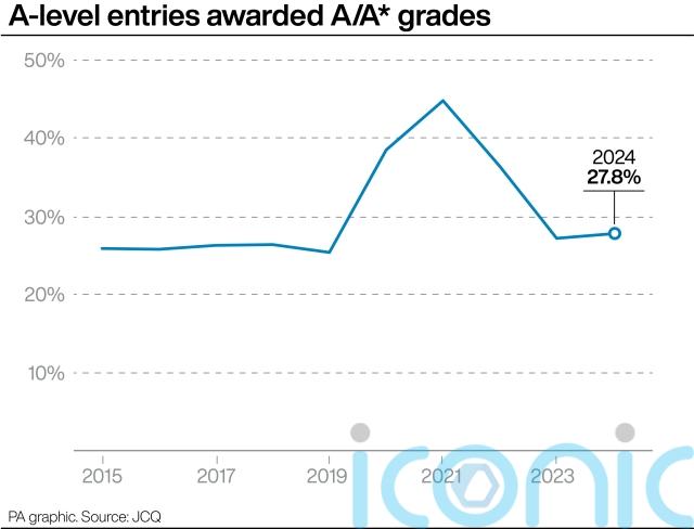 A total of 27.8% of entries were awarded either an A or A*, up from 27.2% in 2023 and above 25.4% in 2019.